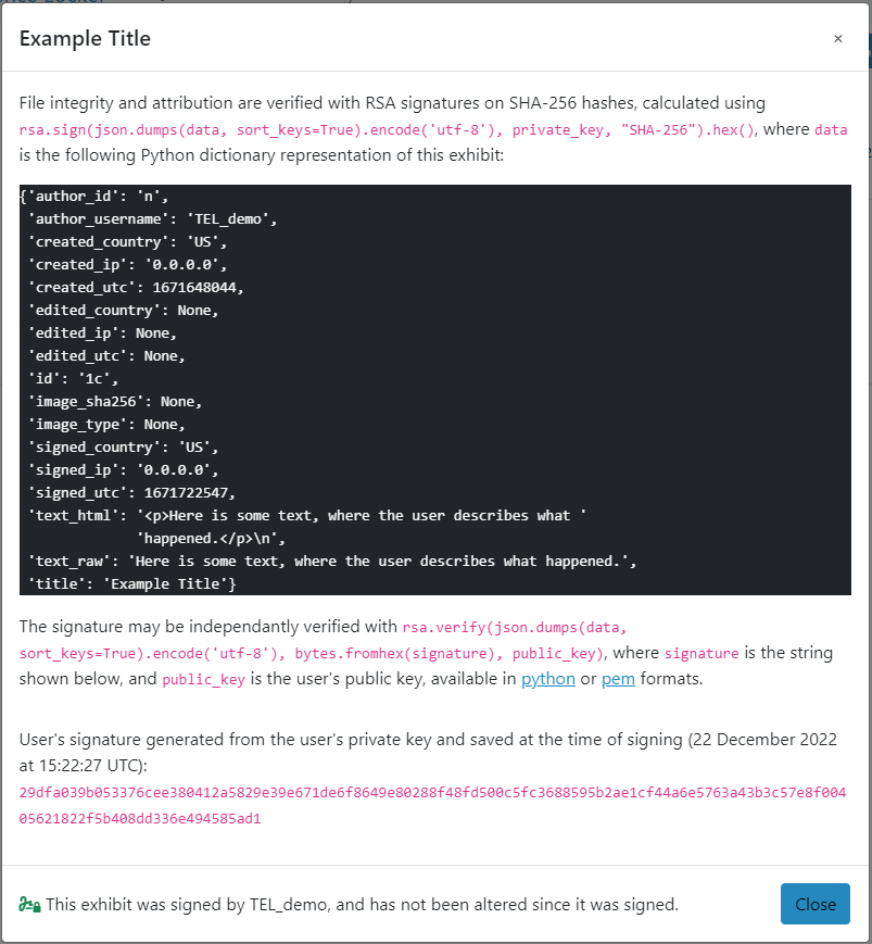 >>> # import rsa and json libraries >>> import rsa >>> import json >>> >>> # copy raw Exhibit data from TEL into a variable >>> data = {'author_id': 'n', 'author_username': 'TEL_demo', 'created_country': 'US', 'created_ip': '0.0.0.0', 'created_utc': 1671648044, 'edited_country': None, 'edited_ip': None, 'edited_utc': None, 'id': '1c', 'image_sha256': None, 'image_type': None, 'signed_country': 'US', 'signed_ip': '0.0.0.0', 'signed_utc': 1671648044, 'text_html': '<p>Here is some text, where the user describes what ' 'happened.</p>\n', 'text_raw': 'Here is some text, where the user describes what happened.', 'title': 'Example Title'} >>> >>> # copy signature string into a variable >>> signature = "29dfa039b053376cee380412a5829e39e671de6f8649e80288f48fd500c5fc3688595b2ae1cf44a6e5763a43b3c57e8f00405621822f5b408dd336e494585ad1" >>> >>> # copy user's Python-formatted public key into a variable >>> public_key = rsa.PublicKey(8555647050898027273016535636036195731439808637554611207272396463285836447566466728987015903224537133895221714709519944149942082827993524870192992289146397, 65537) >>> >>> # Verify signature. Expected output is the name of the hash function used to fingerprint the exhibit data. >>> # Anything else, like an error, means verification failed. >>> rsa.verify(json.dumps(data, sort_keys=True).encode('utf-8'), bytes.fromhex(signature), public_key) 'SHA-256'